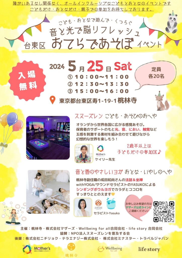 5/25(土)【入場無料】音と光で脳リフレッシュ!台東区”おてらであそぼ”イベント 2024/05/13 イベント 5/25(土)【入場無料】音と光で脳リフレッシュ!台東区”おてらであそぼ”イベント お申し込み・詳細はこちらから